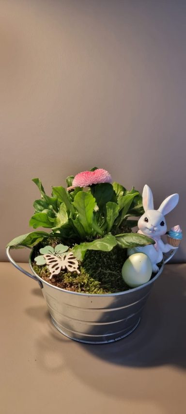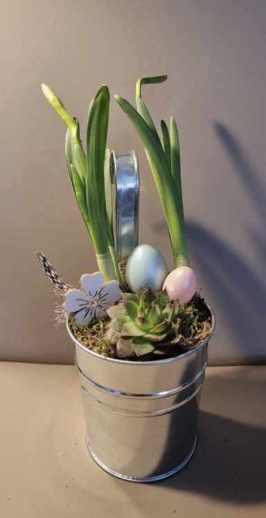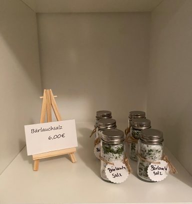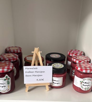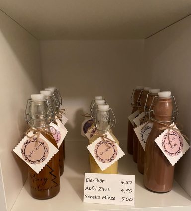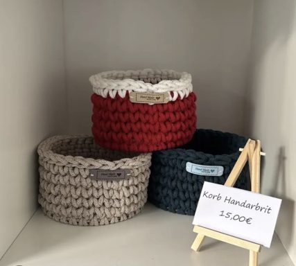 In Handarbeit gehäkelte Körbe, Gestecke zu jedem Anlass, Marmelade, Brotaufstriche, Likör und Gewürzsalze.