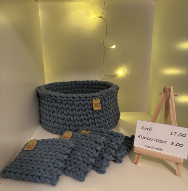 In Handarbeit gehäkelte Körbe, Taschen, Untersetzer, Babymützen uvm.