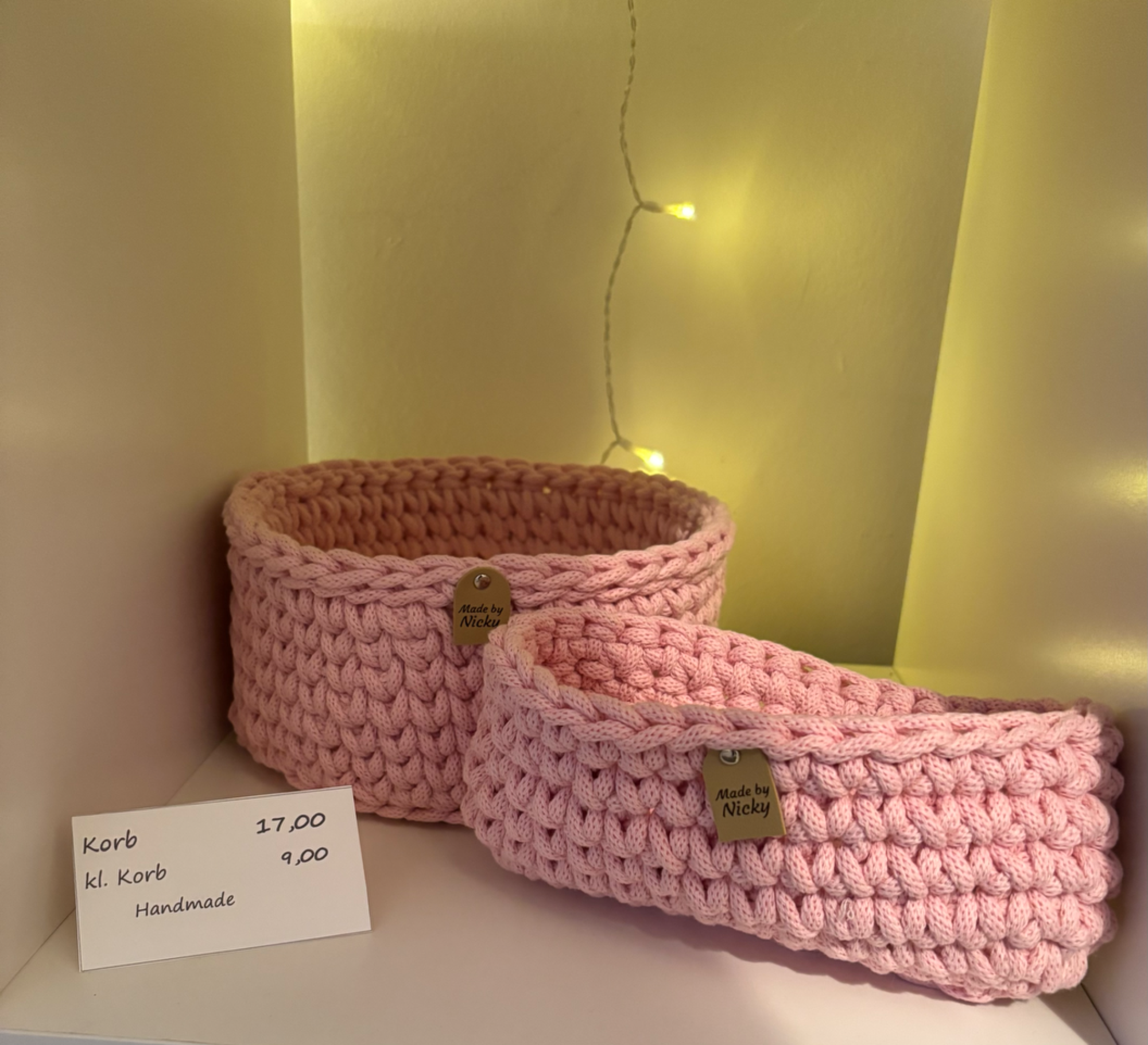 In Handarbeit gehäkelte Körbe, Gestecke zu jedem Anlass, Marmelade, Brotaufstriche, Likör und Gewürzsalze.